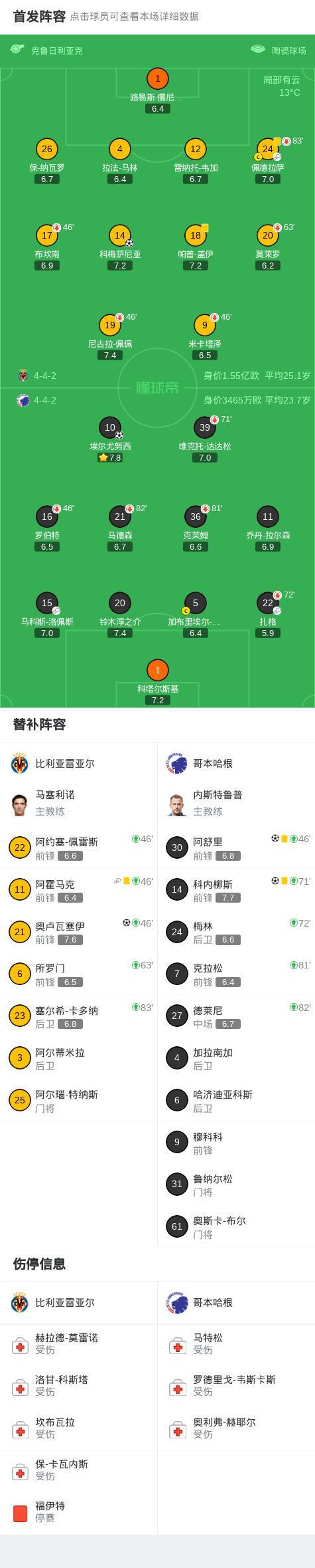 北京时间12月11日西甲日报,欧洲冠军联赛联赛阶段第6轮,比利亚雷亚尔迎战哥本哈根。比赛伊始,哥本哈根迅速取得进球,埃尔尤努西接马科斯-洛佩斯助攻率先破门。下半场易边再战,阿霍马克送出助攻,科梅萨尼亚破门为比利亚雷亚尔扳平比分。仅过片刻,哥本哈根由扎格助攻阿舒里再次将比分超出。随后,佩德拉萨助攻奥卢瓦塞伊建功,双方再度回到同一起跑线。临近终场,科内柳斯攻入关键一球,帮助哥本哈根完成反超。最终,比利亚雷亚尔以2比3不敌哥本哈根。